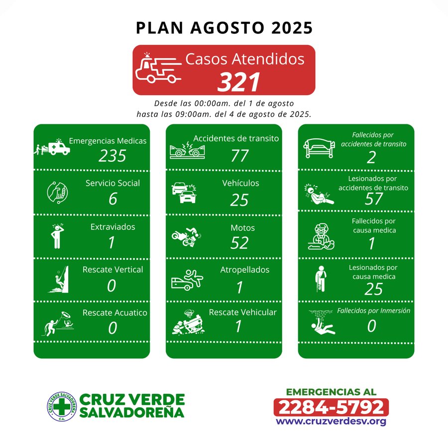 Como parte del despliegue operativo por las vacaciones agostinas, Cruz Verde Salvadoreña presentó un balance preliminar de emergencias atendidas entre las 00:00 horas del 1 de agosto y las 09:00 de la mañana del 4 de agosto.