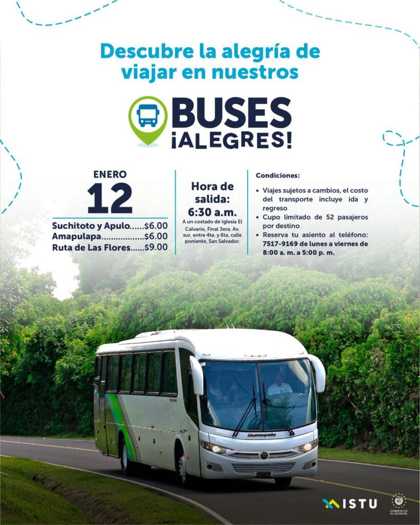 El Instituto Salvadoreño de Turismo (ISTU) ha lanzado una nueva invitación para que la población disfrute de los destinos turísticos más emblemáticos del país a bordo de los populares Buses Alegres.