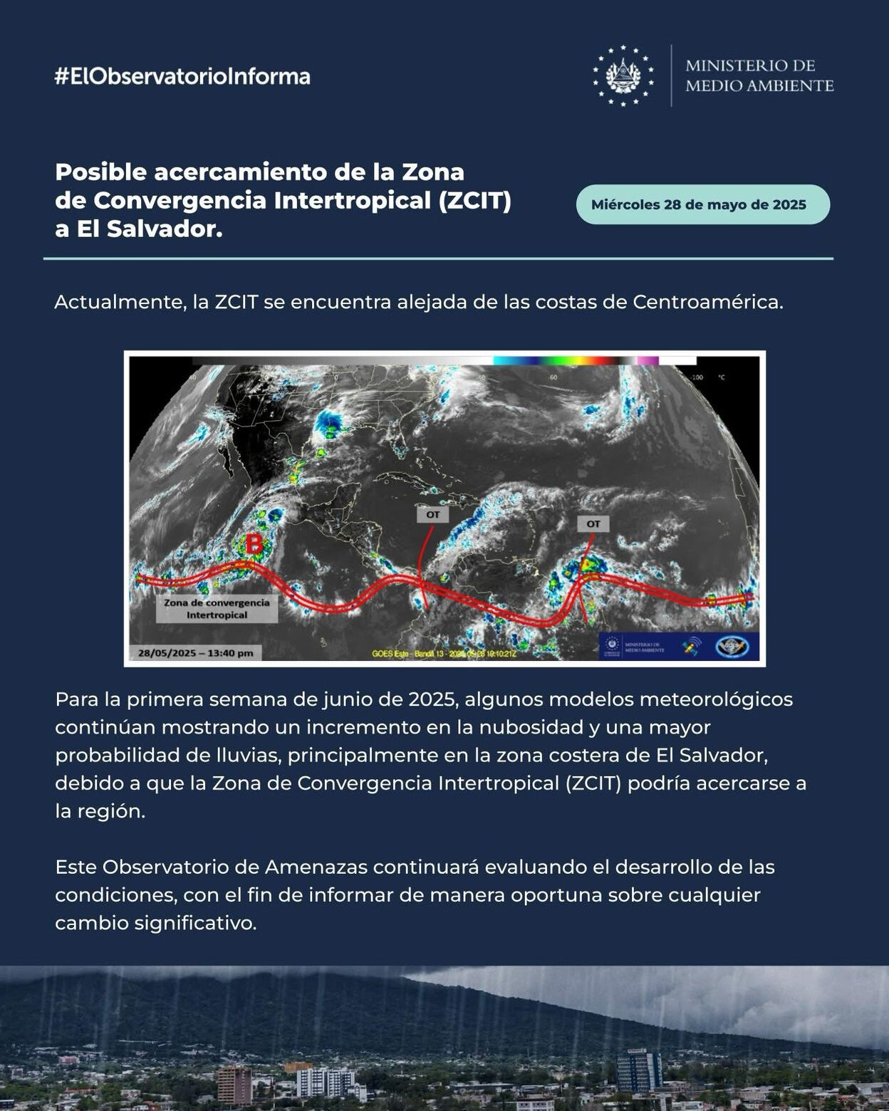 El Observatorio de Amenazas del Ministerio de Medio Ambiente informó este miércoles que la Zona de Convergencia Intertropical (ZCIT) podría acercarse a El Salvador en los próximos días. Esta franja de nubosidad y humedad, ubicada actualmente lejos de las costas centroamericanas, es clave en la generación de lluvias intensas en la región tropical.