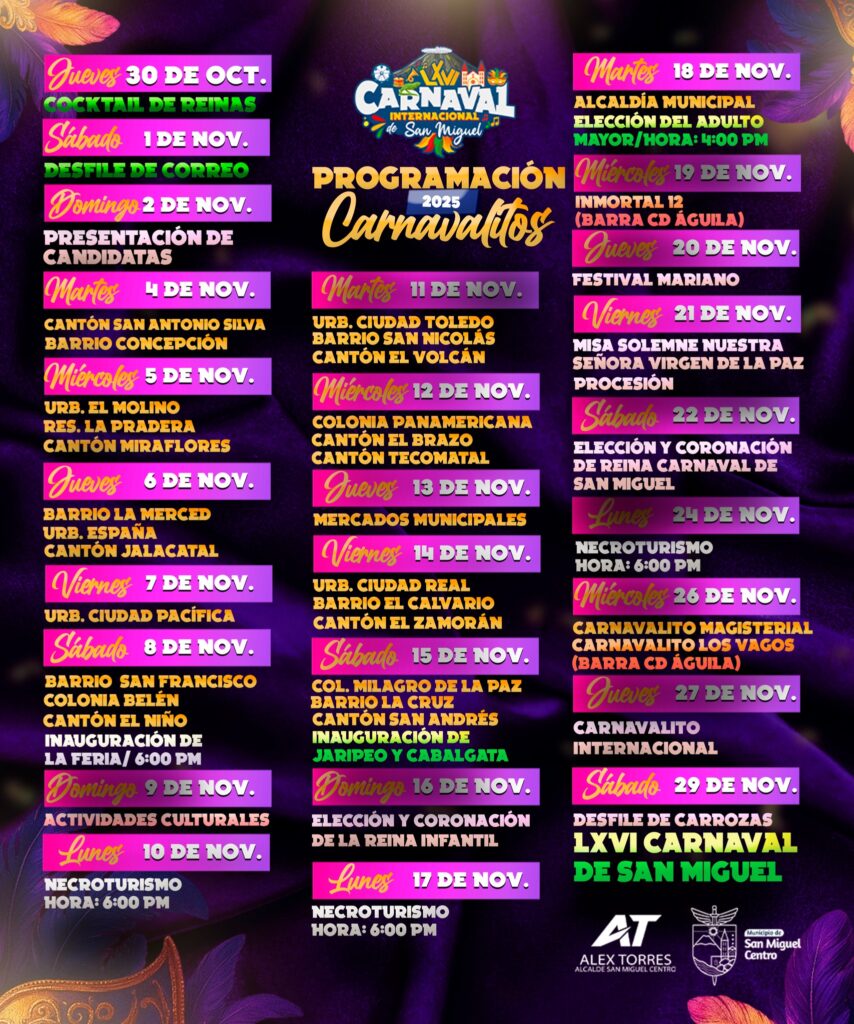 Durante todo noviembre, los barrios, colonias y cantones migueleños serán escenario de los emblemáticos carnavalitos, donde la población podrá disfrutar de presentaciones artísticas, desfiles y actividades culturales. Entre los eventos más destacados figuran el Festival Mariano el 20 de noviembre, y la elección y coronación de la Reina del Carnaval de San Miguel el 22 de noviembre, uno de los momentos más esperados por los asistentes.