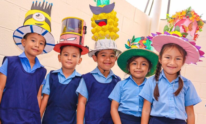 Niñas y niños llegaron emocionados luciendo sus sombreros locos hechos en casa con materiales reciclados, como parte de una actividad lúdica que fomenta la creatividad y el aprendizaje desde la diversión.
