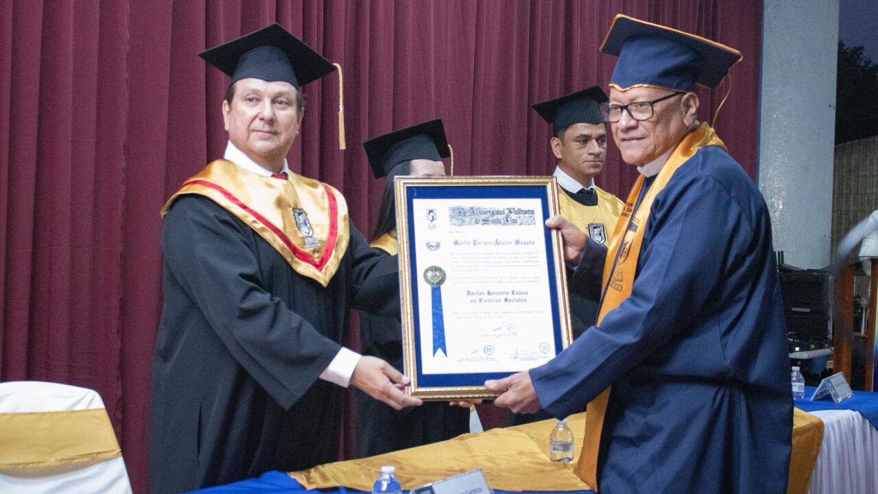 La Universidad Autónoma de Santa Ana (UNASA) celebró un acto solemne en el que otorgó el título de Doctorado Honoris Causa en Ciencias Sociales al Pbro. Martín Ávalos, en reconocimiento a su destacada trayectoria social, humanitaria y educativa, así como por su liderazgo íntegro al servicio de la sociedad salvadoreña.